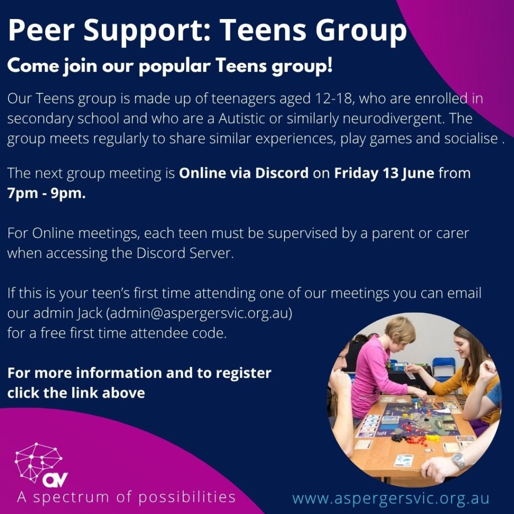 Who is it for: Teens who identify as Aspergers/autistic or with a similar neurodivergent profile, to meet, hang out, and play games or chat in a safe peer environment. A parent/carer must be with them when accessing the Discord server.